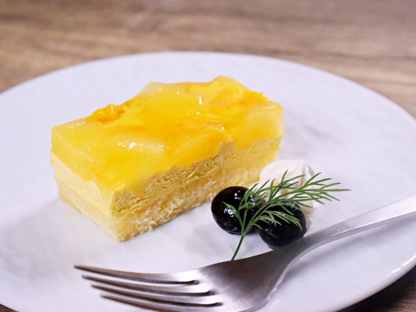 スポンジの上にマンゴームースを重ね、パインとマンゴーの果肉をトッピングした高級感のあるケーキです。