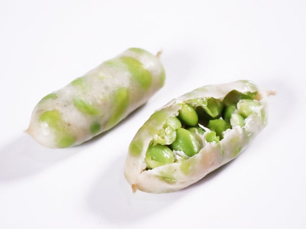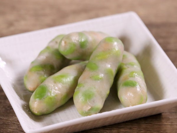 ごろごろと枝豆がたっぷり入って、素材の味が口いっぱいに広がる、天然羊腸に詰めたウインナー風おつまみです。串に刺して、そのまま焼いたり、揚げたり、油との相性が良く色々とアレンジがひろがります。