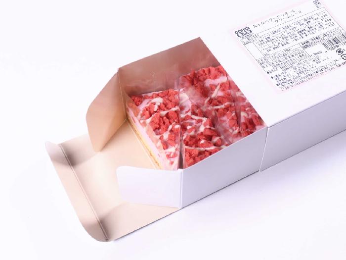 あまおう苺のムースに、ストロベリークランチとホワイトチョコをトッピングした、小ぶりで冷たいまま楽しめるケーキです。