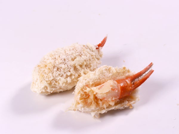 国産紅ズワイ蟹を使用して境港の工場でかに爪フライを作りました。具材のホワイトソースには地元の白バラ牛乳をベースにし、自家製の野菜スープを加えて仕上げました。