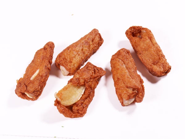 まるごとヤゲン軟骨をいとより・助宗・太刀魚3種を合わせたすり身で包んであげました。コリコリ食感とさつま揚げのような甘いすり身が絶品です。おでん具材にも◎。食感がいいアクセントになり、居酒屋のおつまみに最適です。マヨ七味がよく合います。