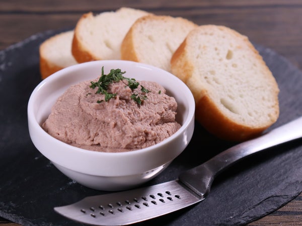 鶏と豚のレバーを合わせて作りました。しっとりなめらかで、塗ったり盛り付けたりしやすい柔らかさです。