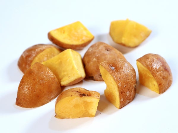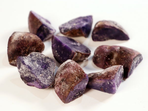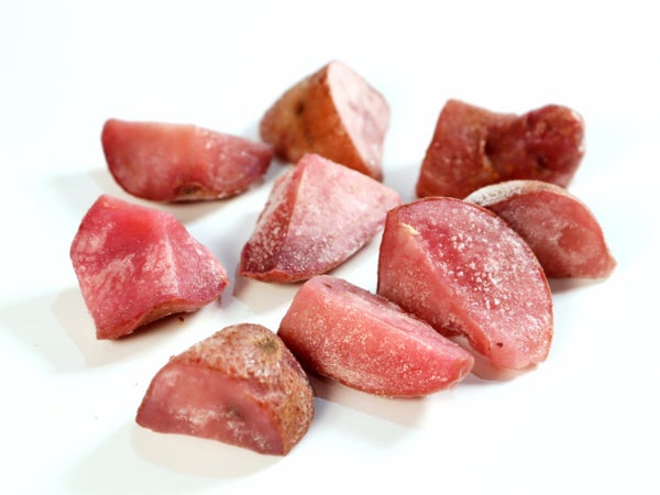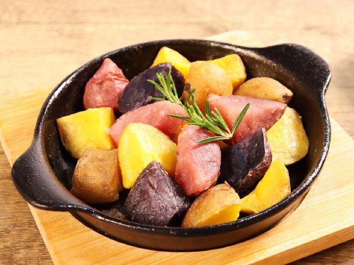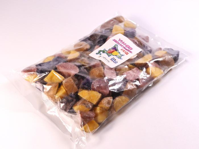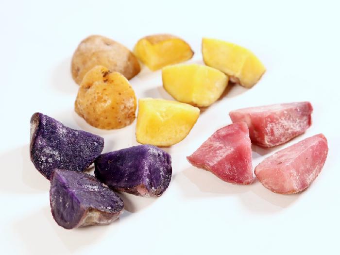 北海道十勝産のじゃがいも「インカのめざめ」「シャドークイーン」「ノーザンルビー」を乱切りにしてブレンドしました。見た目が鮮やかなので、ピザのトッピングやポテトサラダ・せいろ蒸し・付け合わせ(ガロニ)としてご利用ください。フライドポテトにしても面白いです。芋自体の甘みが強いので、素材の味を活かした味付けがおすすめです。