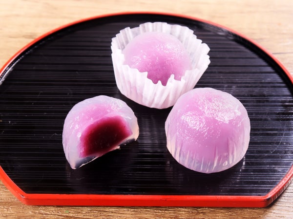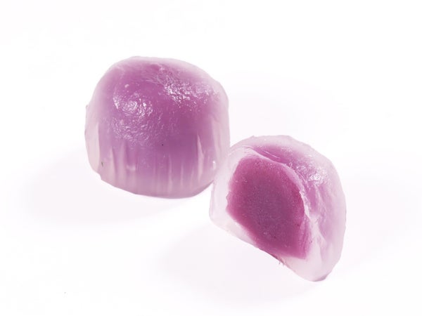 紫いもあんを、もっちり柔らかな葛生地で包んだ、一口サイズ和菓子です。