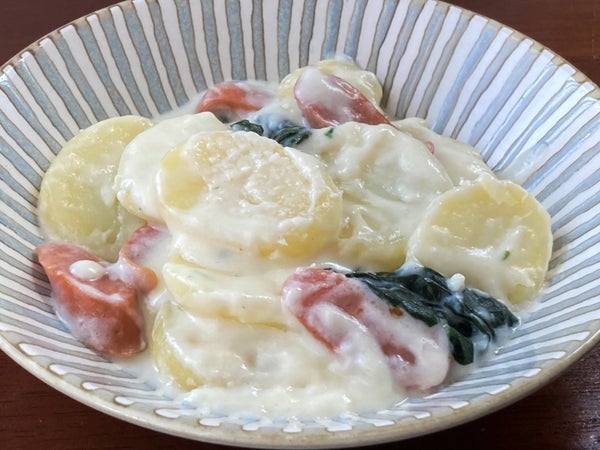 【牛乳を加えて煮る】 じゃがいものクリーム煮のようなメニューも簡単です。塩味は薄いので適宜調味してください。