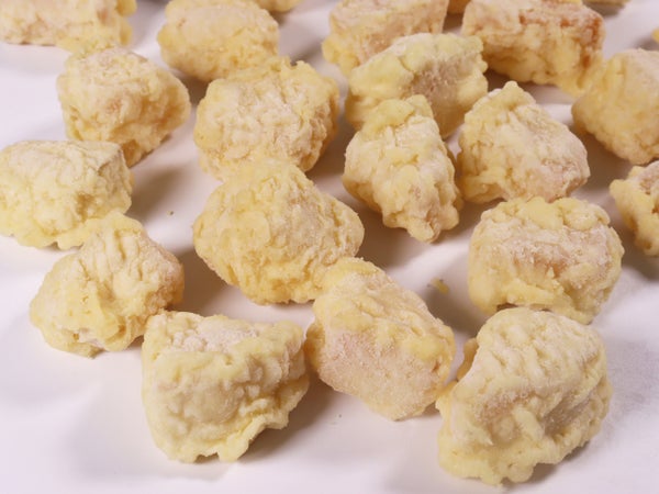 重いので揚げあがっても浮かないことがあります。鍋底での焦げ付きにご注意ください。