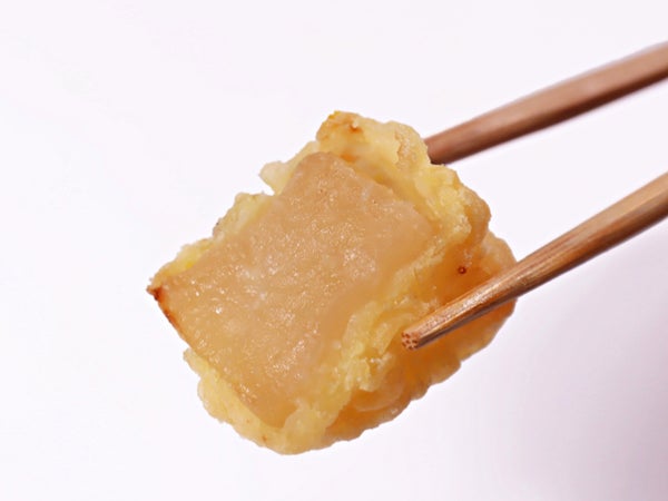 和風だしのうまみを吸ったおでん風の煮大根に衣をつけて揚げました。おでんとも天ぷらとも違う、サクッじゅわっな食感です。シンプルな料理ではありますが、実際に作るのは面倒が多いおでんの天ぷらが手軽に提供できるプリフライ商品です。
