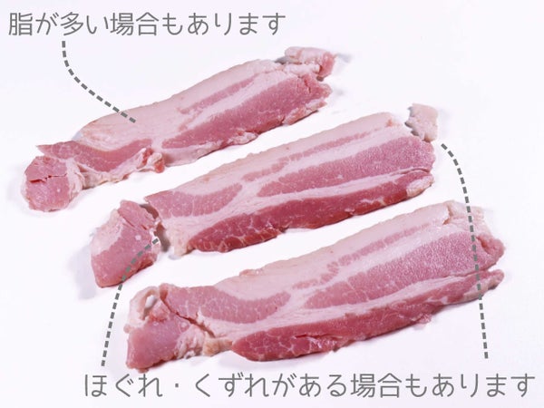 個体差により、脂身が多い少ないや、成形・結着をしていない為、幅(細さ)は一定ではありません。