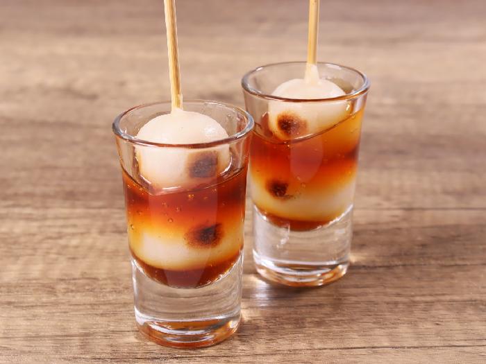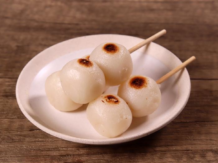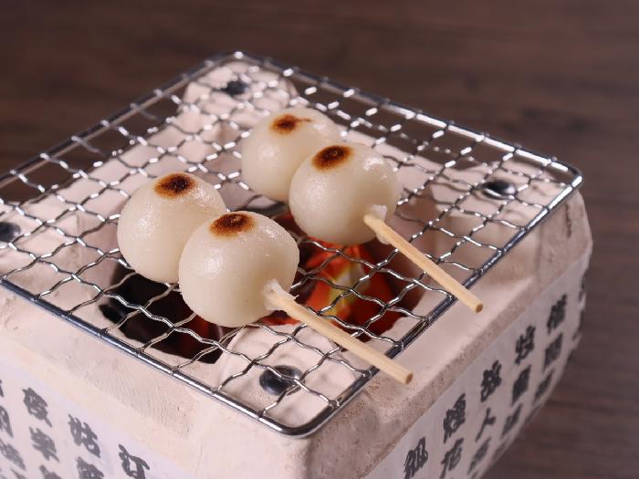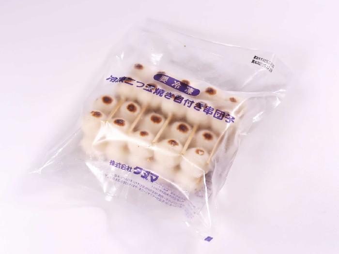 手焼き風の自然な焼き目を付けた、自然解凍で使用できる2つ玉の白生地串だんごです。