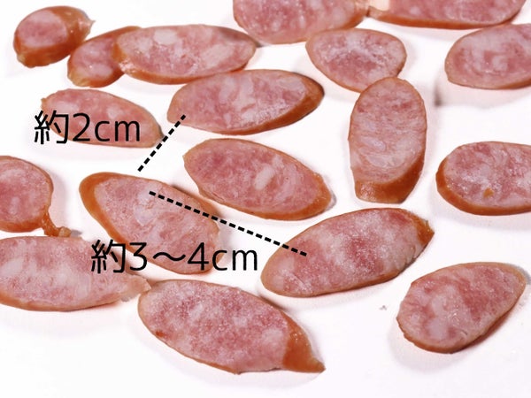 太さ約2cmのウインナーを3mm厚でななめスライスしました。長さはおおむね3~4cm程ですが、両端部分の小さいものも含みます。
