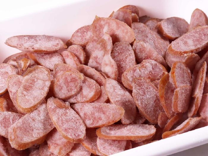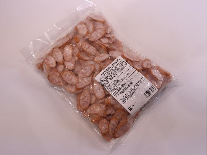 あらびき仕様のポークウインナーソーセージを約3mmで斜めスライスしました。ピザ具材や、ナポリタン、オムレツなどにお使いいただけます。