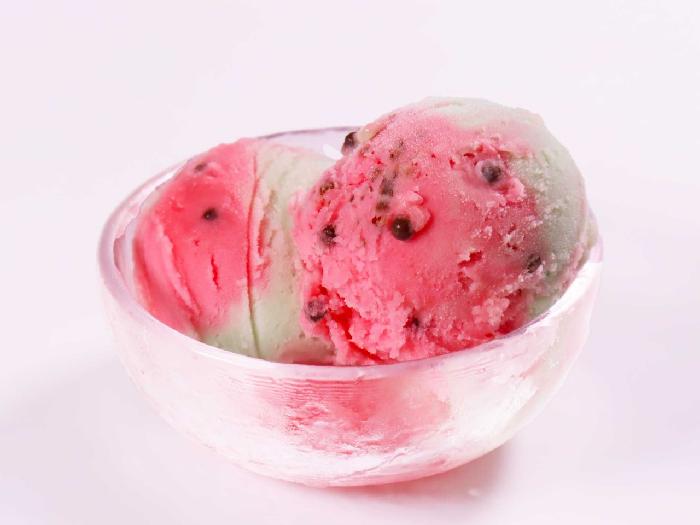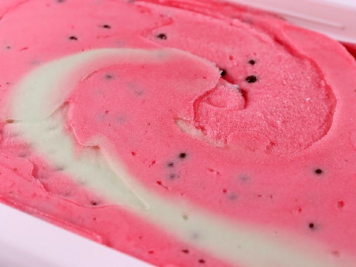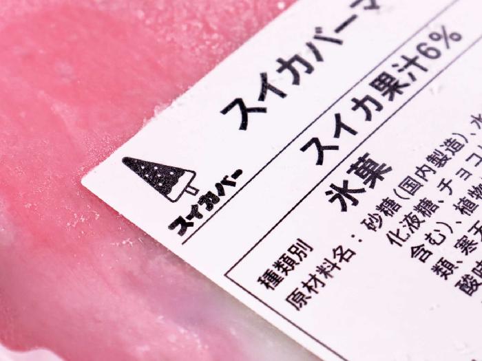 砂糖(国内製造)、水あめ、スイカ果汁、異性化液糖、チョコレートパフ(乳成分・小麦を含む)、植物油脂、食塩/安定剤(増粘多糖類、寒天、セルロース)、乳化剤(大豆由来)、酸味料、着色料(野菜色素、紅花黄、紅麹、クチナシ)、香料、光沢剤、膨脹剤