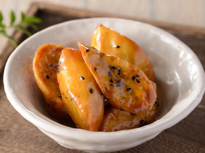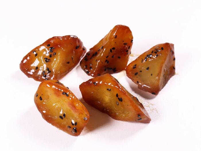 乱切りさつまいもを低温で複数回油調し、お芋の水分量を極限まで抑え、カリカリ食感にし、飴も沖縄県産黒糖とハチミツを使い、風味が良く、飴落ちしにくい仕立てにしています。常温(25℃)で2日間(48時間)はコンディションの変化が起きにくいので、待機時間の長いケータリングやお弁当にも安心してお使いいただけます。