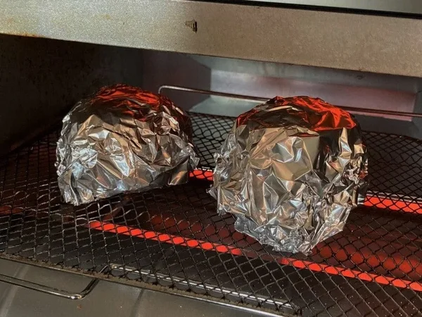 凍ったままアルミホイルで包み、温めたトースターで約3分加熱してください。
