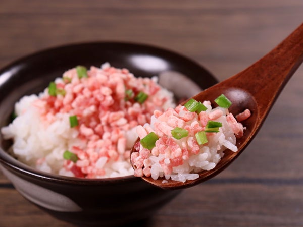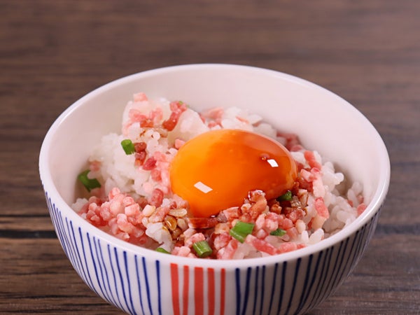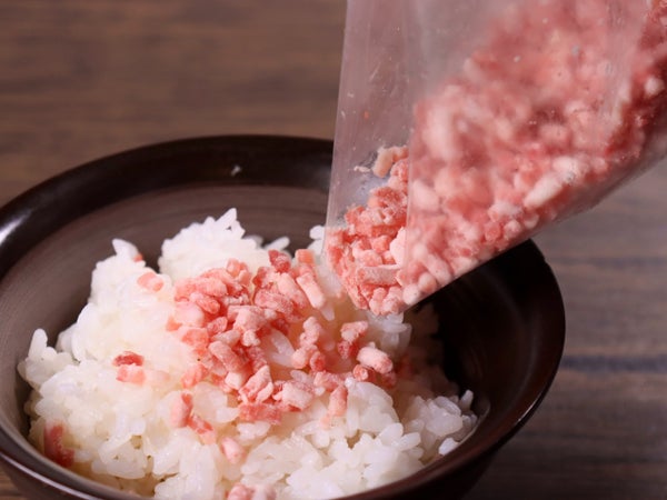 冷凍のままあたたかいごはんにかけると、ふわ~っと溶けてこうね脂がごはんにからんでいきます。