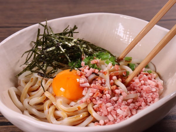 ごはんをうどんに代えて「さくら釜玉うどん」