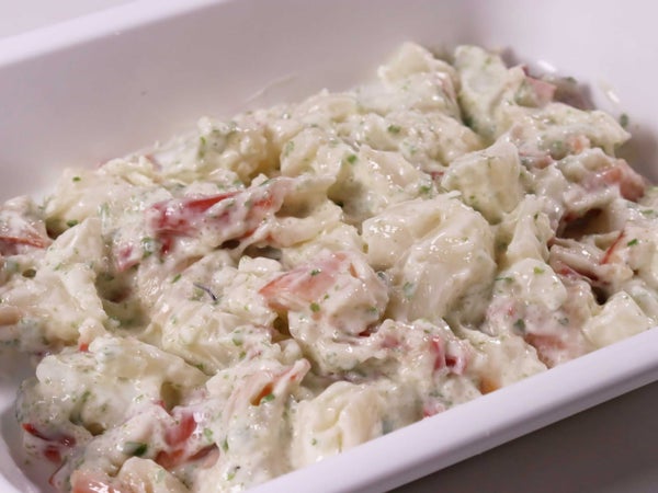 大きめの具材が特長。白いマヨ状ドレッシングにホッキの赤とあおさのりの緑がきれいです。