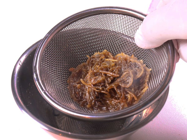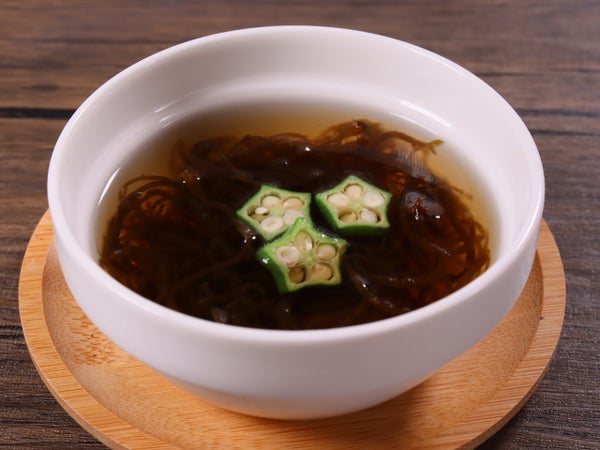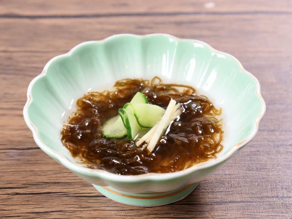 酢の物に。作り置きのもずく酢は調味液の塩分で細くなりますが、ご注文ごとに解凍して提供の直前に調味液をかければ、おいしいもずく酢が提供できます。