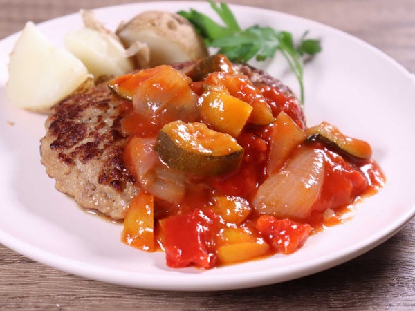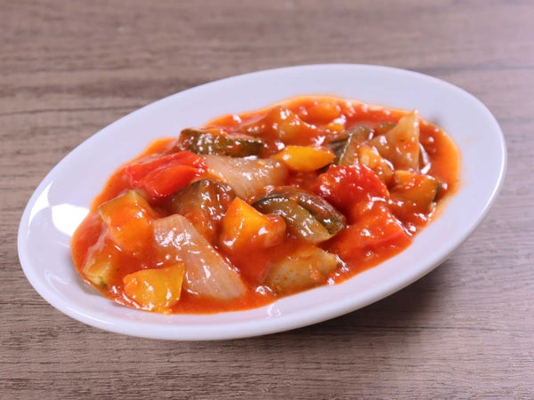 野菜(たまねぎ、ズッキーニ、赤ピーマン、黄ピーマン、なす)、トマト・ピューレーづけ(イタリア製造)、トマトピューレー、ワイン、植物油脂、食塩、砂糖、ゼラチン、トマトペースト、みじんにんにく、レモン果汁、チキンエキス調味料、でん粉、香辛料/増粘剤(加工デンプン、増粘多糖類)、調味料(アミノ酸等)、pH調整剤、(一部に小麦・乳成分・ごま・大豆・鶏肉・豚肉・ゼラチンを含む)