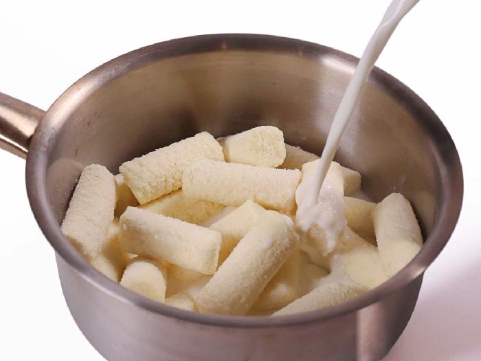 鍋に入れて、水または牛乳を加えます。グルメマッシュポテトの1/4~1/3くらいの量が目安です。