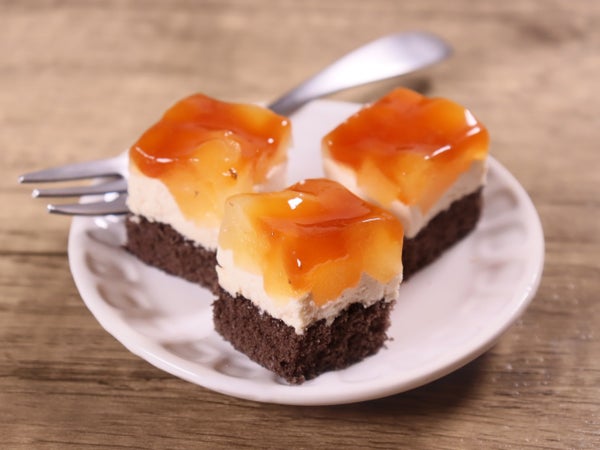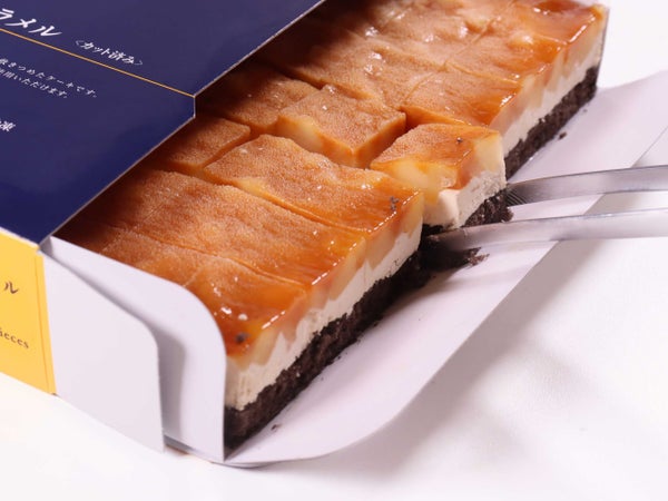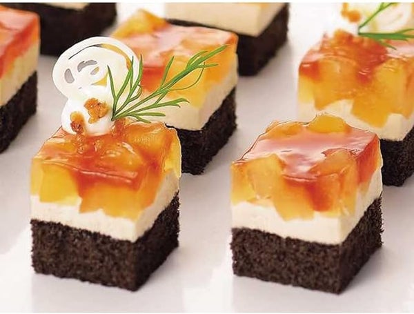 風味のよいキャラメルムースに、りんごの果肉たっぷりのソースを敷き詰めた、スクエアカットのミニケーキです。