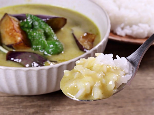 カフェライムリーフ、レモングラスの香り、ココナッツミルクのコク。さらりとした明るい緑色のタイ風カレーソースです。