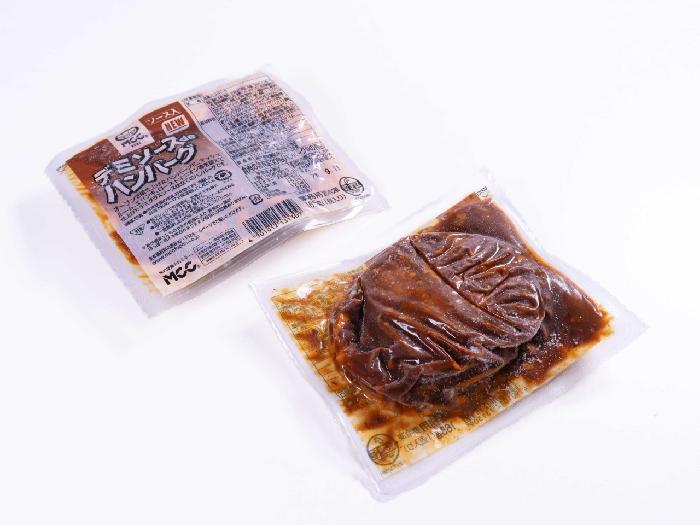 食肉(豚肉、牛肉、鶏肉)、たまねぎ(中国)、牛脂、つなぎ(パン粉、でん粉、粉末状植物性たん白、全卵)、ソテードオニオン、粒状植物性たん白、麦芽エキス、食塩、しょうゆ、香辛料/リン酸塩(Na)、着色料(カラメル、カロチノイド)、調味料(アミノ酸)、香料、ソース(にんじん、赤ワイン、砂糖、牛脂、トマトペースト、ビーフブイヨン調味料、ぶどう酢、大豆油、食塩、肉エキス調味料、フォンドヴォー、ローストオニオンペースト、バター/増粘剤(加工デンプン)、着色料(カラメル、カロチノイド)、調味料(アミノ酸))、(一部に小麦・卵・乳成分・牛肉・大豆・鶏肉・豚肉を含む)