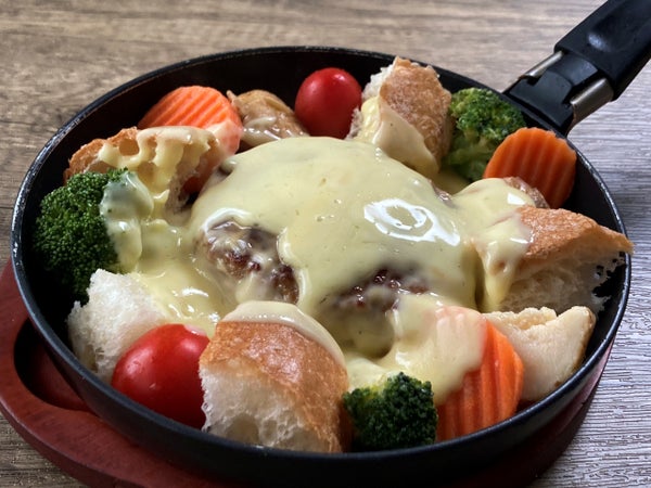 余るほどのチーズソースを生かして、野菜やパンと楽しむ個性的なフォンデュ風ハンバーグメニューが作れます。