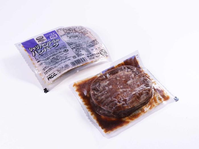 ソテードオニオン、赤ワイン、バター、コニャック等を使った本格的なシャリアピンソース仕立てのハンバーグですソースがたっぷり入っているので盛り付けもサマになります。また、ソース充填タイプなので湯煎するだけで簡単に提供する事ができます。