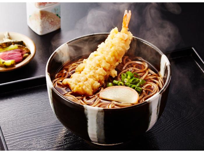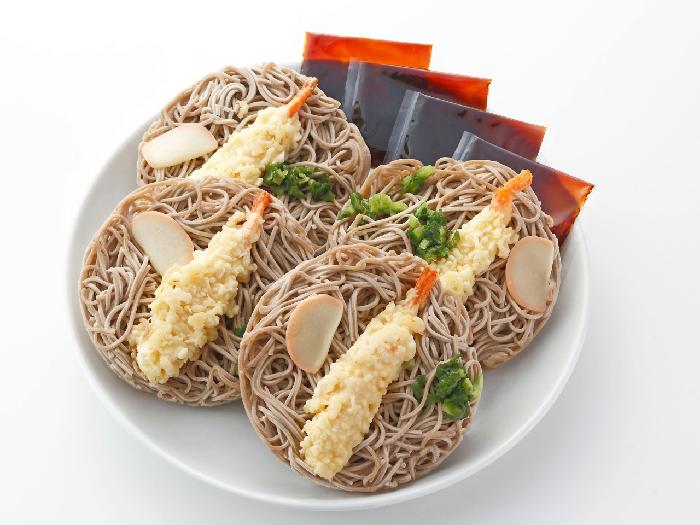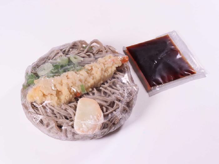風味豊かなそばに、えび天ぷら・かまぼこ・ねぎを添え、かつお・さば・椎茸のだしを利かせた濃縮そばつゆをセットしました。