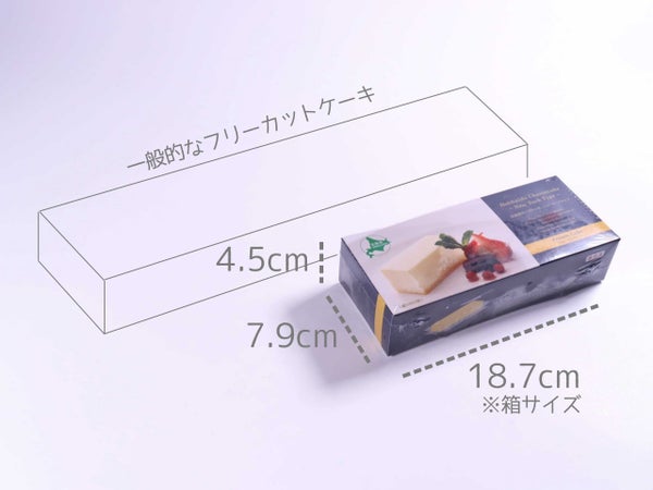 一般的なフリーカットケーキの半分の長さ。冷凍庫/冷蔵庫でストックしやすく、残り少なくなっても、箱がコンパクト。