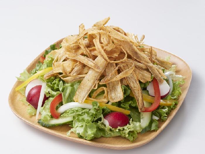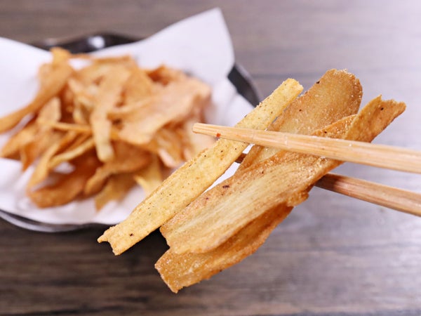 薄くスライスしたごぼうにスパイシーな唐揚げ粉を付けた、サクサク食感のおつまみ唐揚げです。サラダやうどんのかさましトッピングにも重宝する一品です。