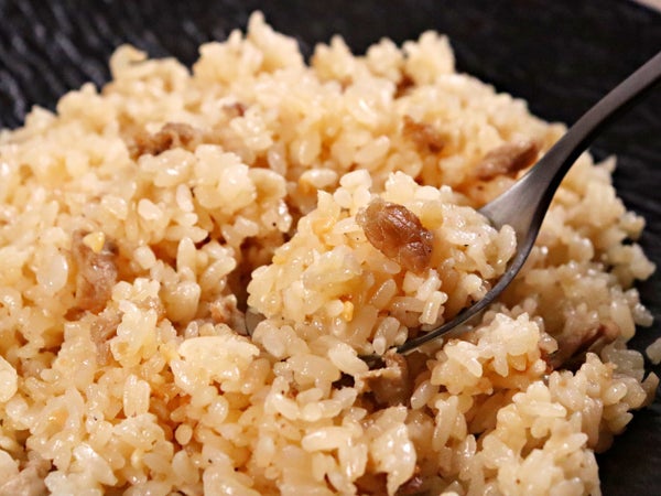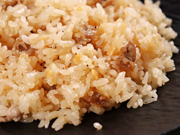 フライドガーリック、おろしニンニク、みじん切りのニンニクの3種のニンニクを使用。よく見るとガーリックの粒々がしっかり入っています。