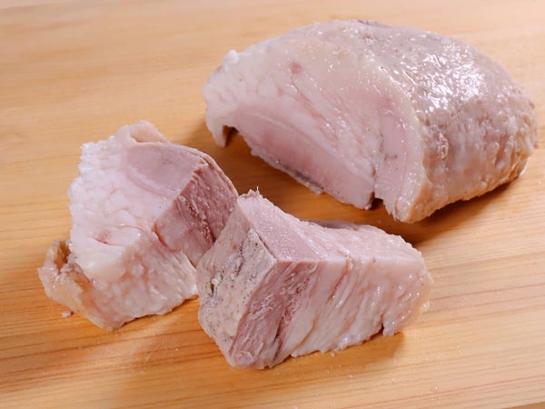 豚バラ肉を使いやすいサイズのブロックで茹で上げました。脂の付き方は一定ではありません。