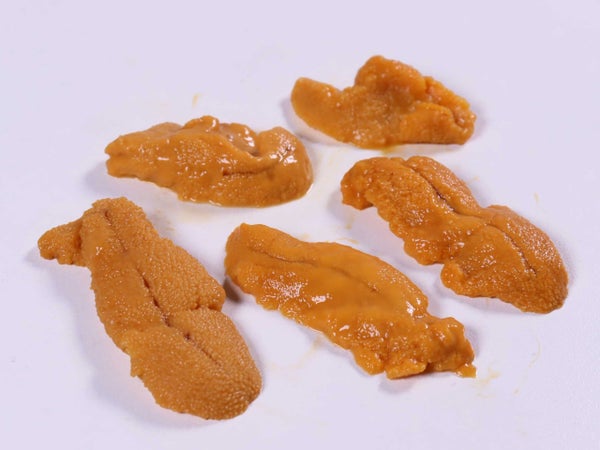 並べて凍結してあります。身崩れしにくく扱いやすいので、うに身の形状が見える盛り付けや料理にお使いください。