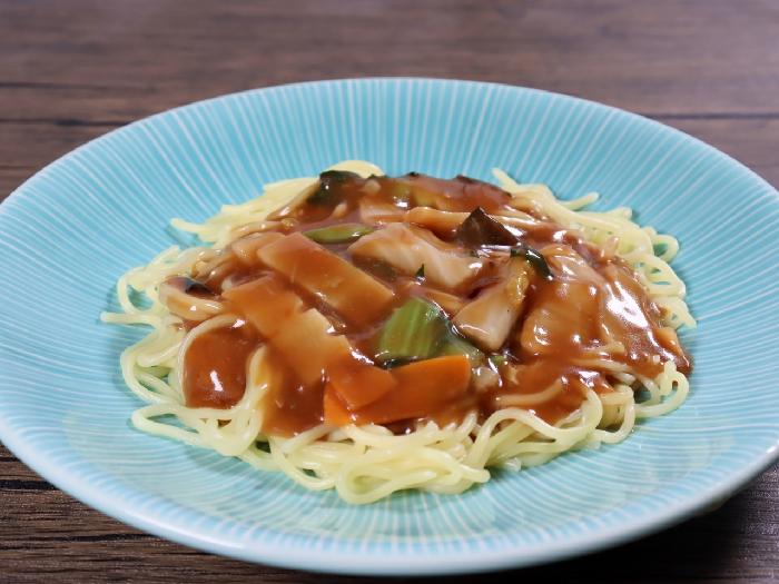 自家製太麺を使用したあんかけ焼きそばです。“あん”には6種の具材(白菜、チンゲン菜、きくらげ、たけのこ、にんじん、豚肉)を使用し、オイスターソース、ごま油が香るように仕立てました。電子レンジ調理可能なマルチクック仕様です。