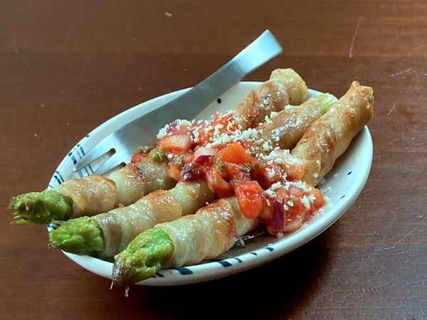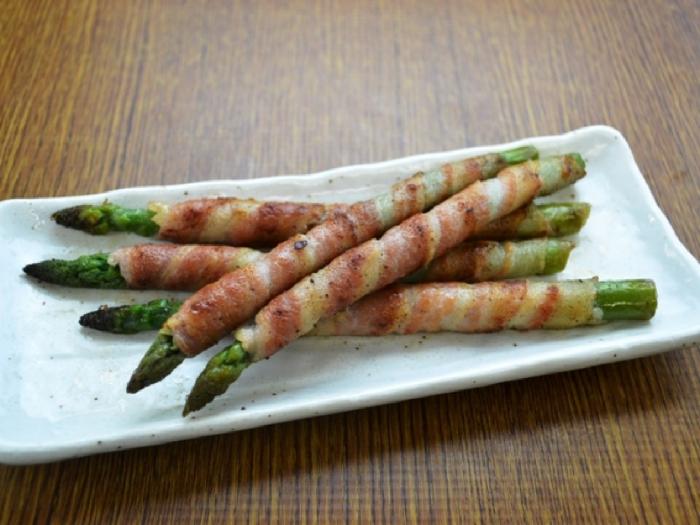 太めのアスパラガスを長いまま、生ベーコンで巻きました。加熱ベーコンのようなチープさがなく、肉のうまみと塩気が、アスパラガスによく合う最高の組み合わせです。生のアスパラにはかなわないものの、十分に食感やおいしさが感じられます。