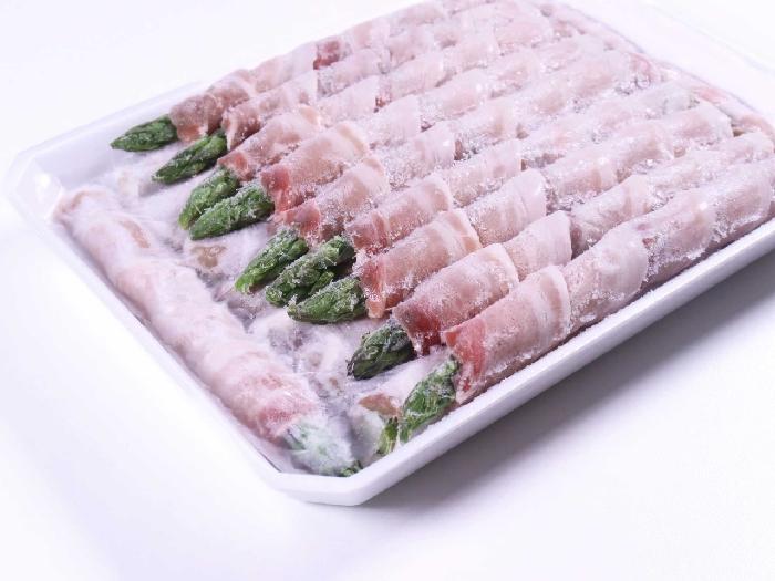 グリーンアスパラ(中国産)、豚肉(フランス産又はスペイン産又はオーストリア産)、食塩、砂糖、片栗粉、水飴/pH調整剤、調味料(アミノ酸等)、(一部に豚肉を含む)