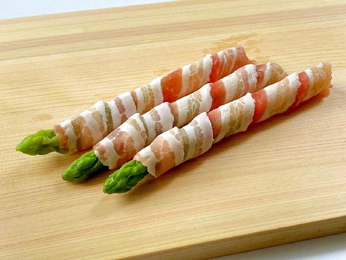 アスパラガスを切らずに1本そのまま、生ベーコンで巻きました。焼くと旨みがじゅわっと広がります。