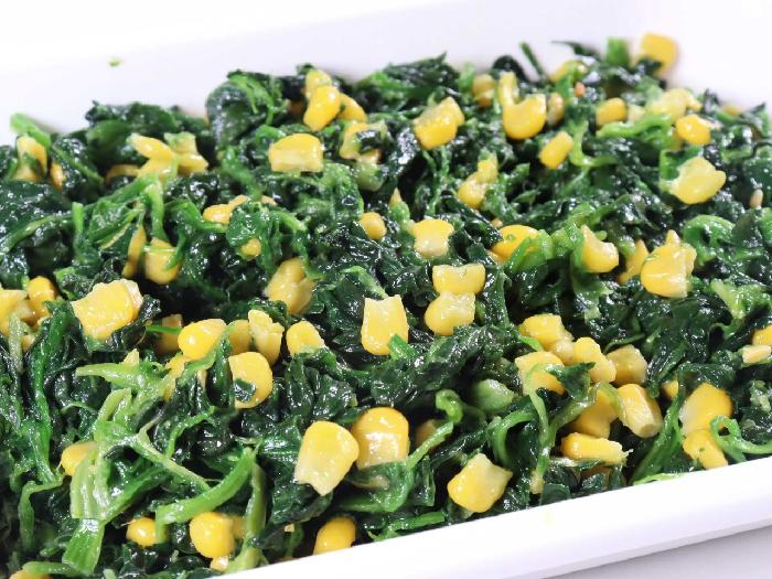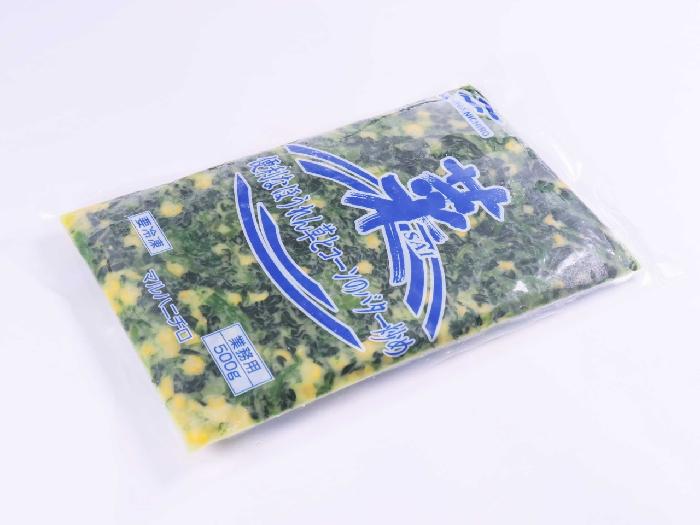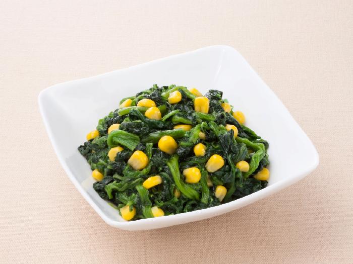 ほうれん草をバターで炒め、仕上げにコーンを加えました。彩りの良いツヤ感とバターの風味が特徴です。自然解凍で使えるので、付け合わせやガロニに使い勝手の良い一品です。