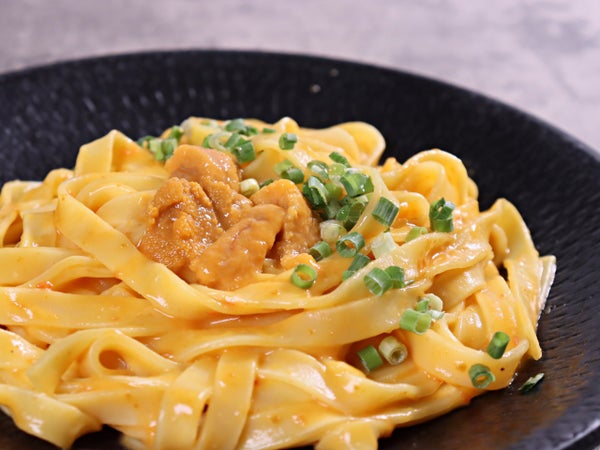うにのクリームパスタの仕上げに