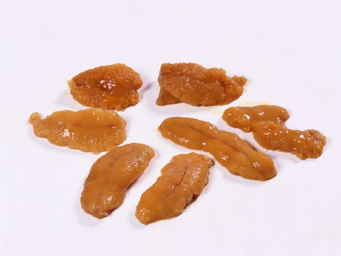 チリ産ウニを表面だけブランチングした、ミョウバン不使用の冷凍ウニです。色味は明るめのAグレード相当です。1枚ずつ並べて凍結してあるのでトッピングなどの形を活かしたいメニューにおすすめです。