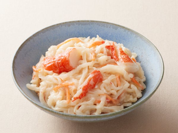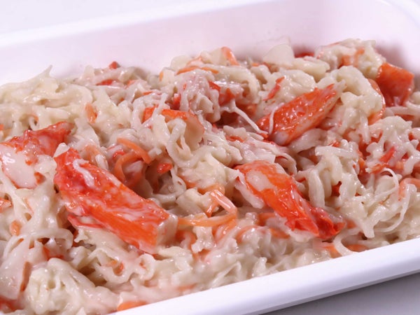 カニカマに切干大根・にんじんを加え、マヨ風味に仕上げた洋風サラダです。ゴロっとしたものとほぐしたもの、2種類のカニカマを使用し、見栄えと食感にこだわりました。離水も少なく、パンにはさむなどのメニューにもおすすめです。