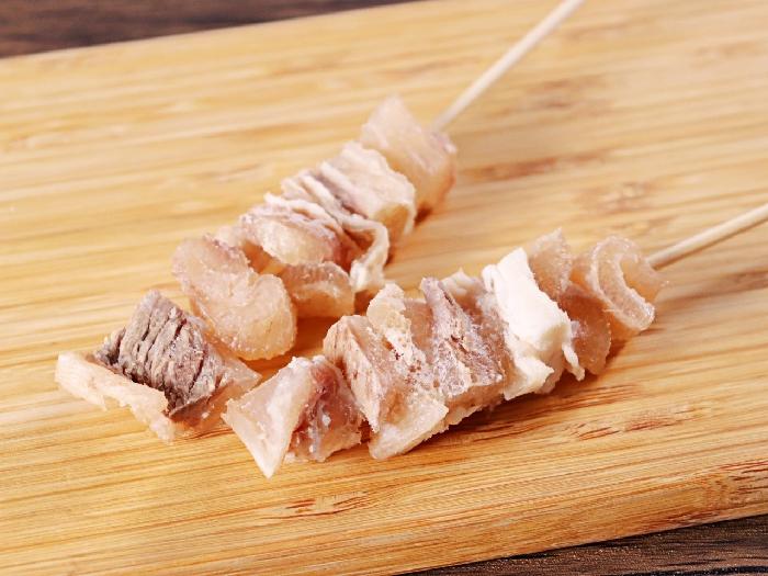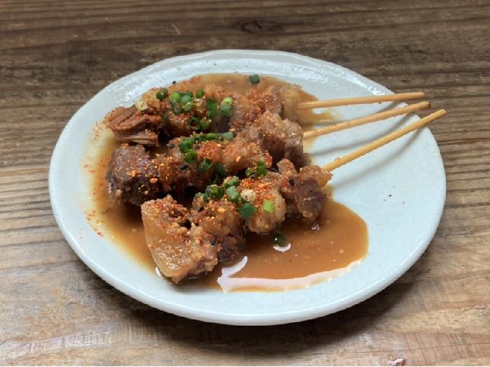 ボイルした牛スジを丁寧に串にしました。おでん・どて焼きに最適です。