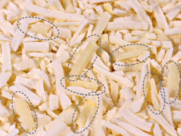 植物油脂加工品シュレッドとナチュラルチーズシュレッドを8:2でミックスしたシュレッドチーズタイプです。見えにくいですが点線で囲ったところがチーズシュレッド。