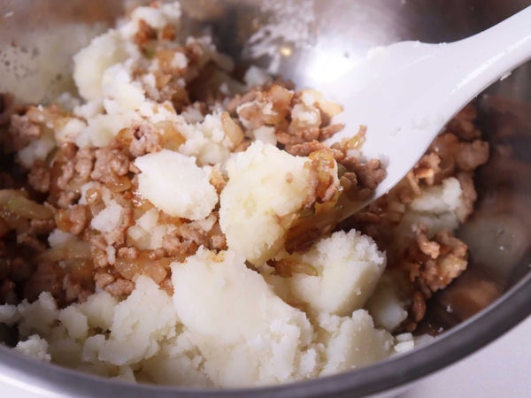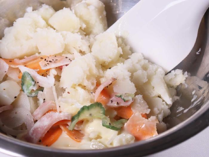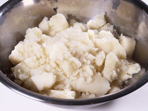 じゃがいもを3~4cmほどにカットしてスチームで蒸し上げ、マッシャーで手作業で粗くマッシュしています。なので粗さは均一ではありません。