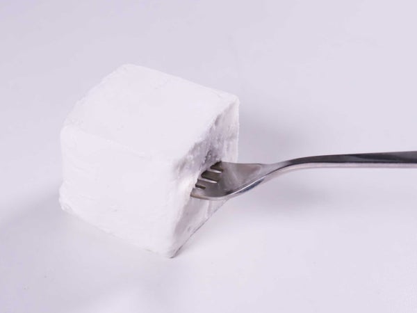 フォークやスティックを刺してください。スティックは幅があるものが安定します。中が凍っているのでちょっと力がいりますが、マシュマロをつぶさないようにじんわり刺してください。
