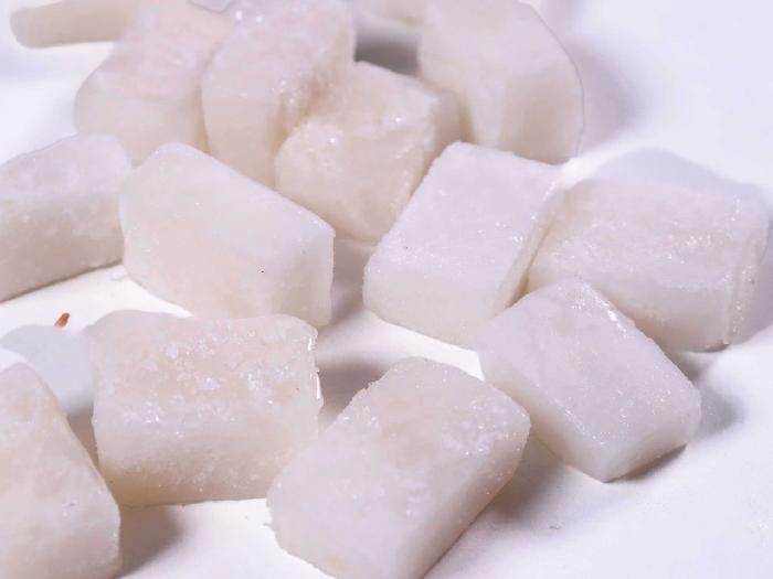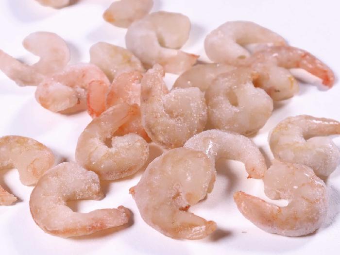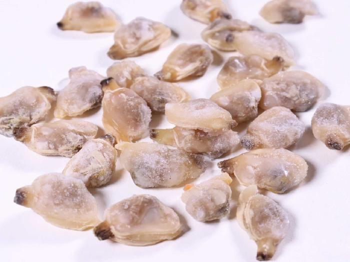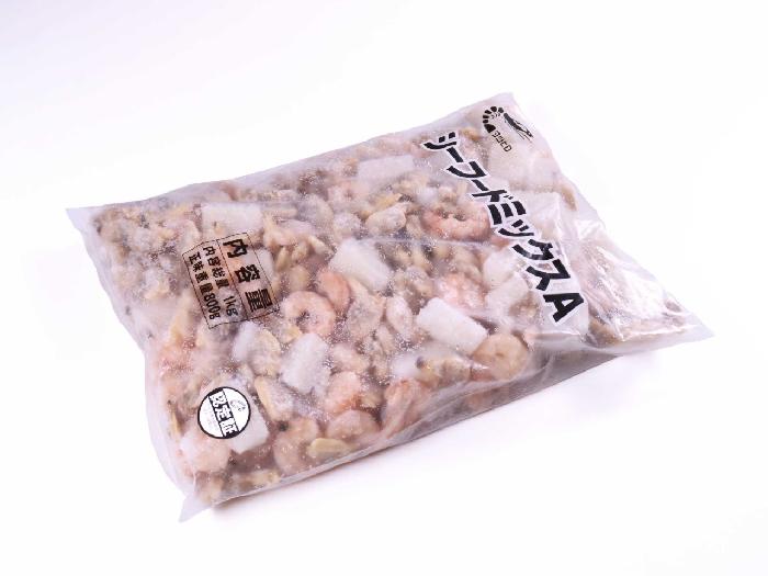 グレーズ(品質保持の氷膜)が付いていて、正味重量は約800gです。イカ40:エビ30:アサリ30の配合。