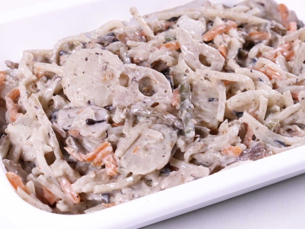 じゃがいも(国産)、マヨネーズ、ごぼう、にんじん、大黒くわい、大豆、れんこん、ごま、ひじき、しいたけ、砂糖、わらび、たけのこ、こんにゃく、ひらたけ、わさび(茎)、ぜんまい、米発酵調味料、しょうゆ、植物油脂、食塩、醸造酢/グリシン、増粘剤(加工でん粉)、調味料(アミノ酸等)、水酸化カルシウム、香辛料抽出物、(一部に卵・小麦・ごま・大豆を含む)