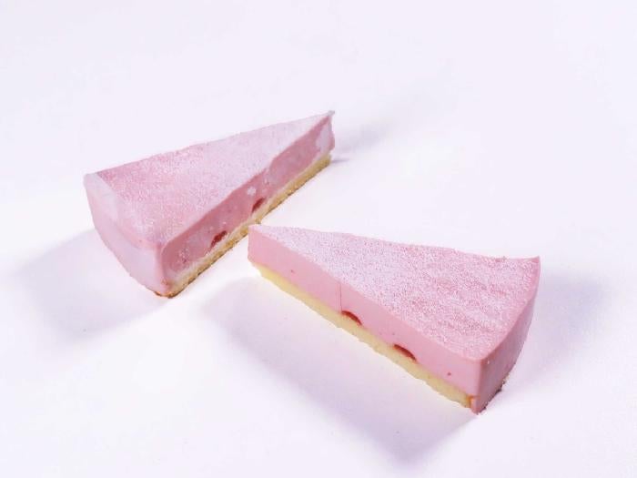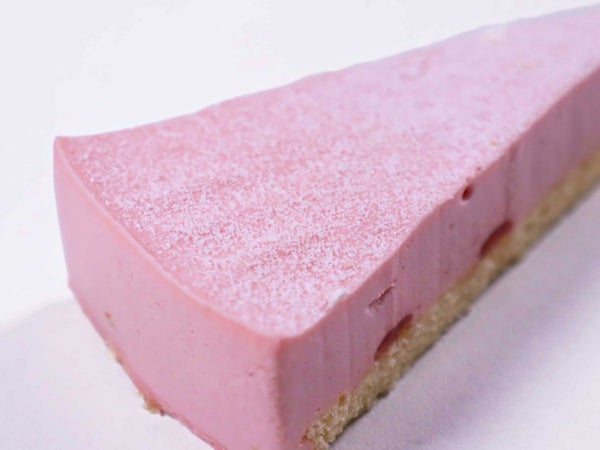 スポンジの上にあまおう苺ソースを入りのあまおう苺のムースを重ね、ホワイトチョコパウダーで仕上げた、酸味と甘味のバランスがよいケーキです。ムースの隠し味にラズベリーピューレを加え、ベストな甘酸っぱさに整えています。